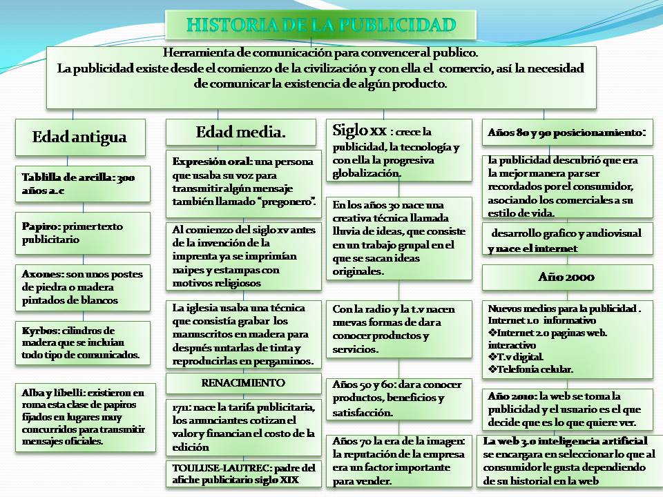 Mapa conceptual historia de la publicidad 1. Si bien este es un mapa conceptual sencillo realizado en power point es posible de enriquecer mediante su publicacion en alguna herramienta en linea y a partir de ello. Cuadro sinoptico tipos de publicidad copia.